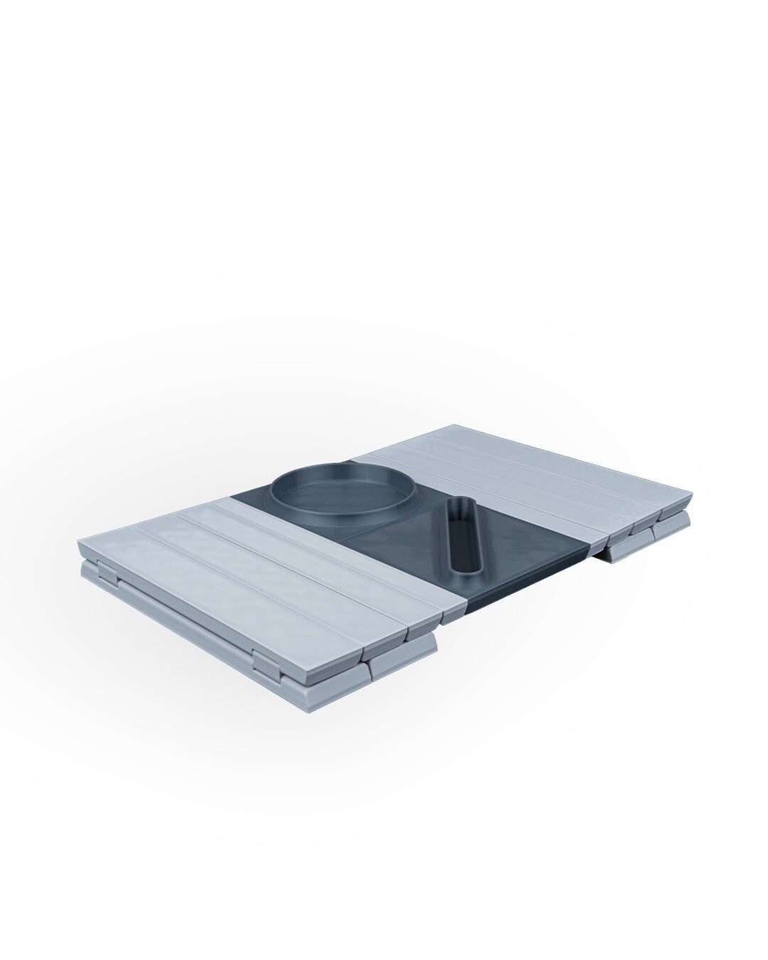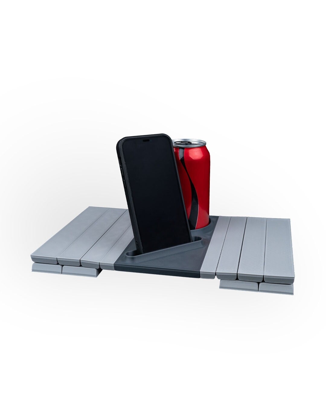 Minimalistisches Design, maximale Stabilität: Das Tablett legt sich mit seinen flexiblen Seitenteilen passgenau über jede Armlehne und schafft eine sichere, ebene Oberfläche. Der integrierte Organizer ist bewusst schlicht gehalten und bietet: