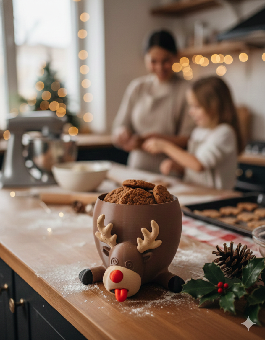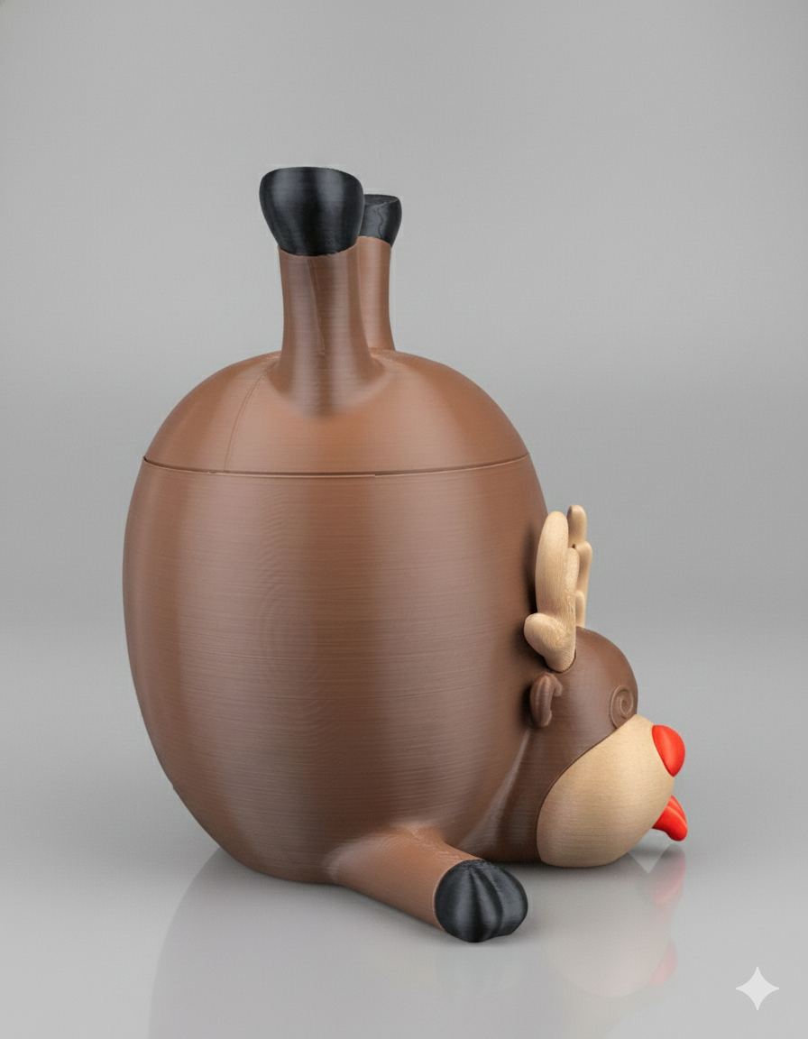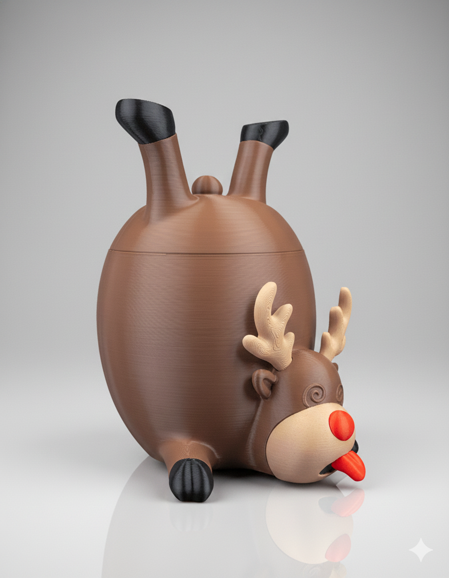 Dieser 3D-gedruckte Rentier-Behälter ist der lustigste Keks-Wächter, den du dir vorstellen kannst! Das umgedrehte Rentier, das frech die Zunge herausstreckt, ist die perfekte, humorvolle Ergänzung für deine Weihnachtsdekoration.