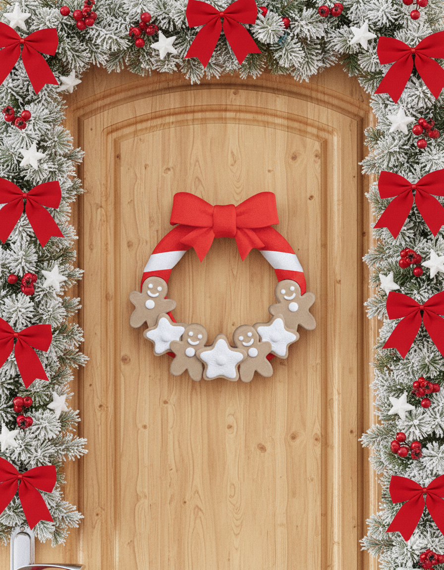 Dieser fröhliche, 3D-gedruckte Türkranz ist die perfekte "süße" Ergänzung für deine festliche Dekoration! Der Kranz selbst ist im Design eines rot-weiß gestreiften Zuckerstabs gehalten und wird von kleinen, lachenden Lebkuchenmännchen (auch bekannt als Gingerbread Men) und Sternen verziert.